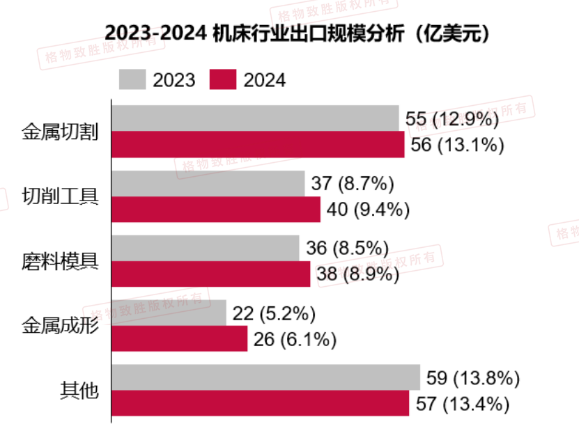 2024年,机床工具行业整体出口同比增幅较上年度扩大2.8个百分点,其中金属切削机床、金属成形机床、木工机床、机床功能部件(含零件)、切削刀具、量具量仪等产品的出口都实现了增长,其中金属成形机床和木工机床的出口更是呈两位数增长,对行业的整体运行起到重要的支撑作用。