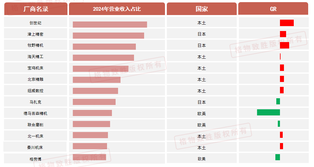 机床整体市场较为分散,头部厂商目前为本土的新兴机床厂、传统机床厂和外资机床厂为主,排名前五的企业分别是创世纪、津上精密、牧野精机、海天特工和宝鸡机床,其中有三家为本土企业。