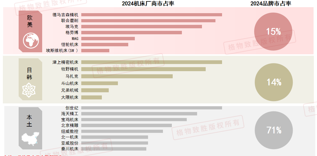 欧美厂商在航空航天高端领域份额较高,日韩品牌在精密加工等领域具有深厚的技术积累,本土高端机床近几年发展较快。