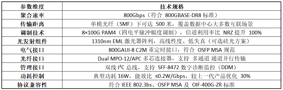 8×100G 并行通道设计,实现 800Gbps 聚合速率;