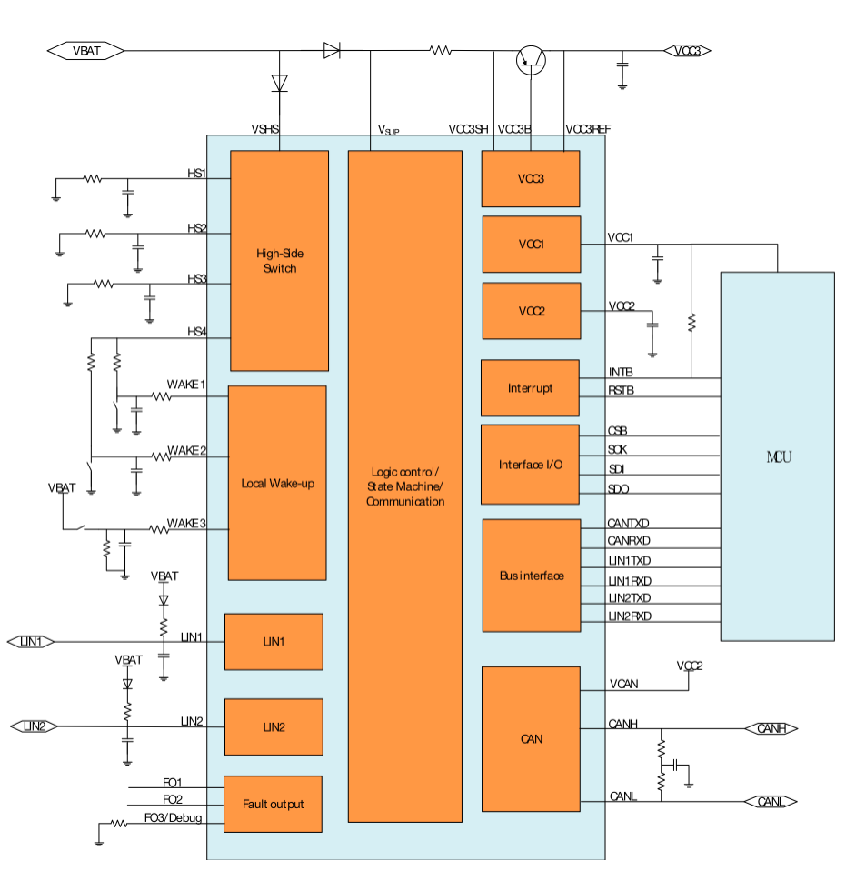 - 3V/5V LDO1@250mA,主要用于给MCU 供电,集成过压/欠压/过流诊断,可与LDO3 并联增大电流输出能力。