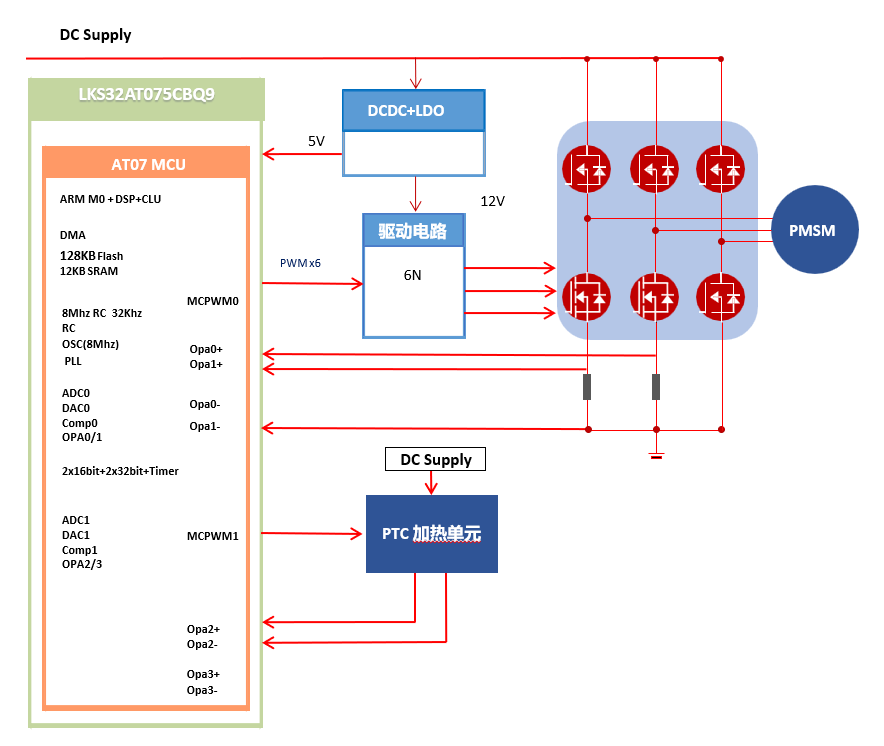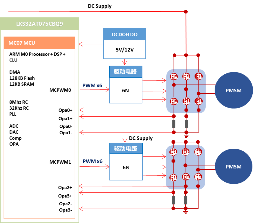 LKS32AT075采用96MHz 32位Cortex-M0内核,集成自主指令集的电机控制专用DSP、12路电机控制专用PWM、4路差分OPA、3个比较器及2路12位ADC等模块。