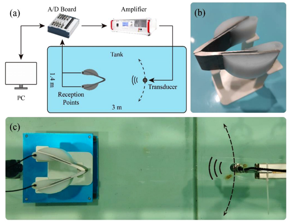本实验,搭建了水下声学测量系统进行实验,探究仿生水下声接收器的接收增益与接收指向性。C通过数据采集卡产生激励脉冲波形,经功率放大器放大后施加到水声换能器上,向水中辐射声波。水听器嵌入于仿生声接收器后端,实时接收水中的声压幅值。