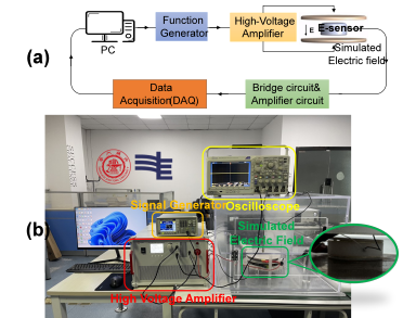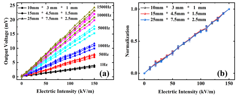 实验内容:室温保持在25℃,湿度为50±10%,在标准的大气压强101kPa下进行测试。使用增益为0-2000可调的高压放大器(ATA-7050,Aigtek,中国),对信号发生器产生电压信号进行放大,通过导线连接至两平行铜板,在平行铜板间产生均匀的电场。通过调整信号发生器与高压放大器的增益倍数,调整电场的电场强度以及频率范围,检测传感器的输出信号,并完成采集,计算相关的性能参数。