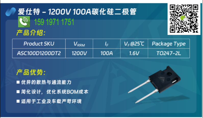 为实现100A级二极管续流能力而采用多管并联,是否正让您的设计陷入均流调试、布局复杂和可靠性担忧的困境?爱仕特科技量产推出的 ASC100D1200DT2(1200V/100A SiC肖特基二极管),以单管实现百安通流,直击多管并联核心痛点,助力工程师打造更简洁、更稳健的高功率系统。