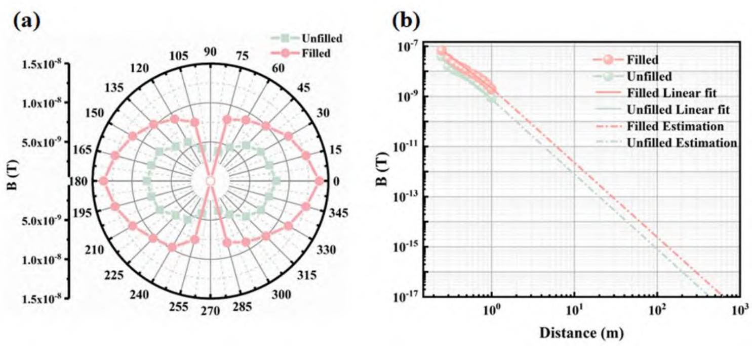 图2:最佳偏置下MoS2填充前后磁电复合材料:(a)近场辐射特性(b)磁场强度随实测距离变化曲线