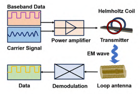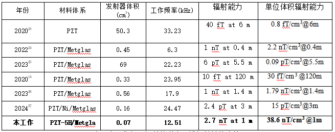 实验过程:在磁电复合系统中采用锁相放大器驱动亥姆霍兹线圈生成直流偏置磁场与螺线管激发交流磁场,通过功率放大器调控压电纤维谐振状态;同步在MoS2改性粘接层的PZT/Metglas复合结构中量化磁发射强度与1m处辐射场强;利用信号发生器生成ASK调制信号,通过信号分析仪解析波形保真度;结合声阻抗模型计算应力传递效率,基于磁偶极子方程外推远场辐射强度,最终建立声学匹配参数-磁电转换效率的定量关联模型。