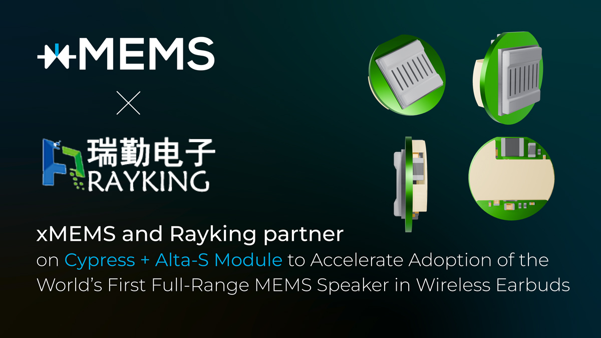 xMEMS Labs宣布与东莞市瑞勤电子有限公司(Rayking)达成战略合作,双方将共同开发Cypress+Alta-S一体化扬声器模块,应用于新一代真无线耳机(TWS earbuds)。此次合作延续xMEMS的重大里程碑——将全球首款全频MEMS扬声器Cypress及其配套的Alta-S ASIC投入量产。