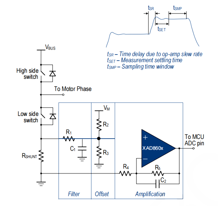 通过外接采样电阻和XAD860x构建的差分放大电路,可准确检测电机相电流,适用于变频器和伺服驱动系统。