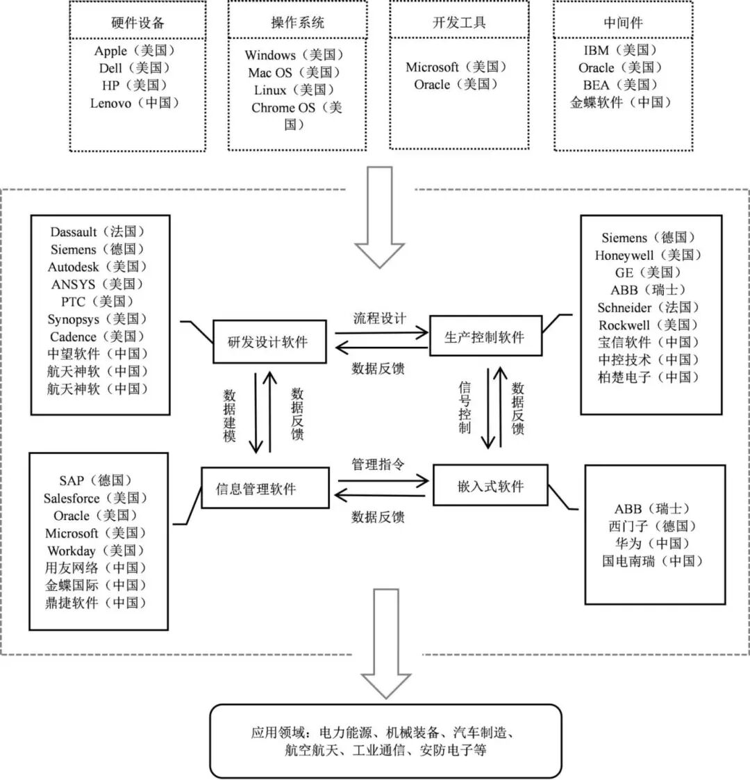 目前,在我国市场中,工业软件产业链上游及中游占据主导地位的是国外厂商,如上游的苹果、微软,中游的SAP、西门子,这些企业通过频繁横向扩展和纵向积累,拥有最尖端的人才、科技与创新资源,控制着整个生态系统。