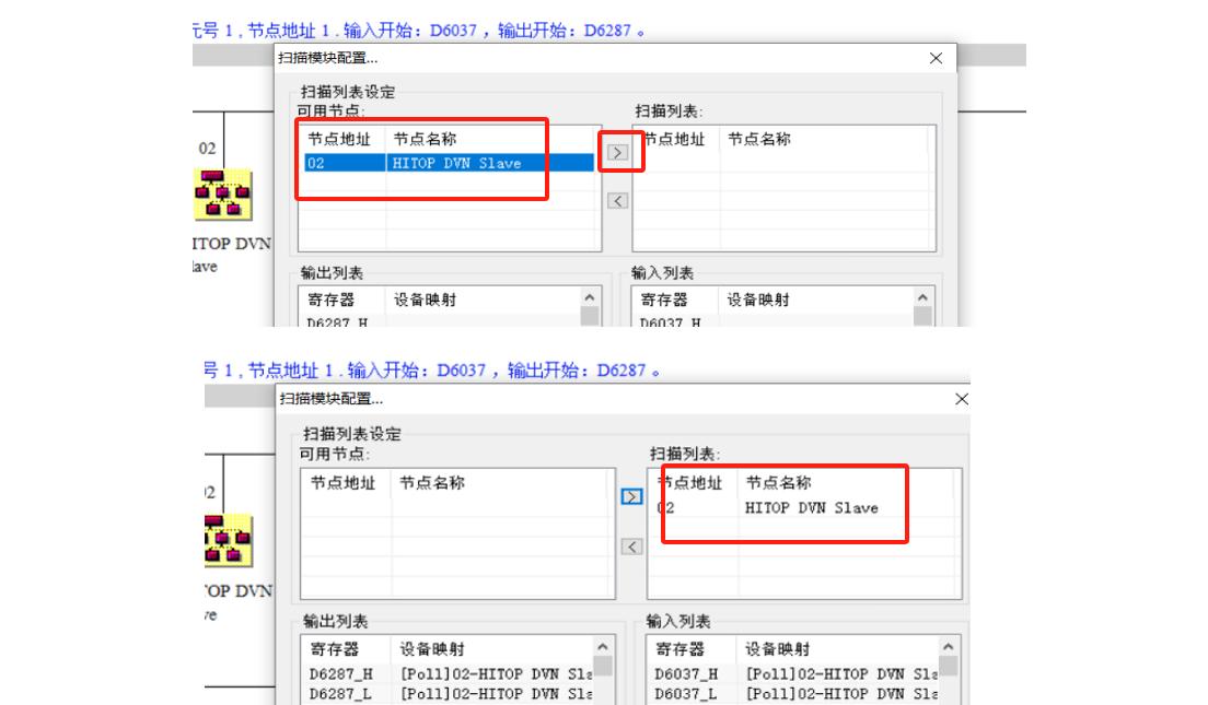 6、双击主站图标,将扫到的从站设备添加到主站扫描列表,如下图所示: