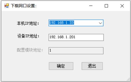 在弹出的窗口中选择本机电脑网卡即本机IP地址,连接网关P1口,并输入网关即设备IP地址(这里是192.168.1.201),点击确认按钮。注意,计算机网卡地址和网关地址要在同一网段。