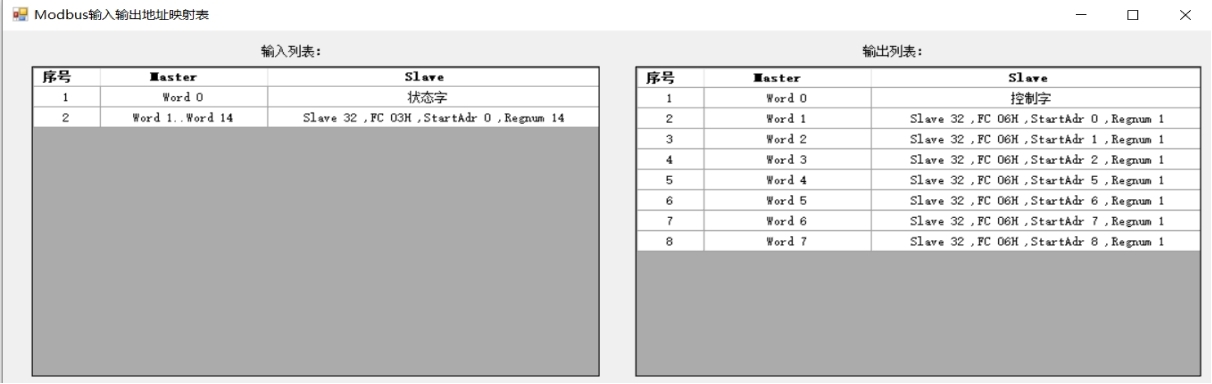 双击“Modbus Master”,然后点击“地址映射表”,查看所有地址寄存器。这里除了从站的寄存器之外,还有一个状态字和控制字,因此,输入有14个字,输出有8个字。如下图所示: