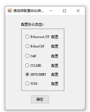 在协议选择框中选择“Devicenet配置”,点击确认按钮。
