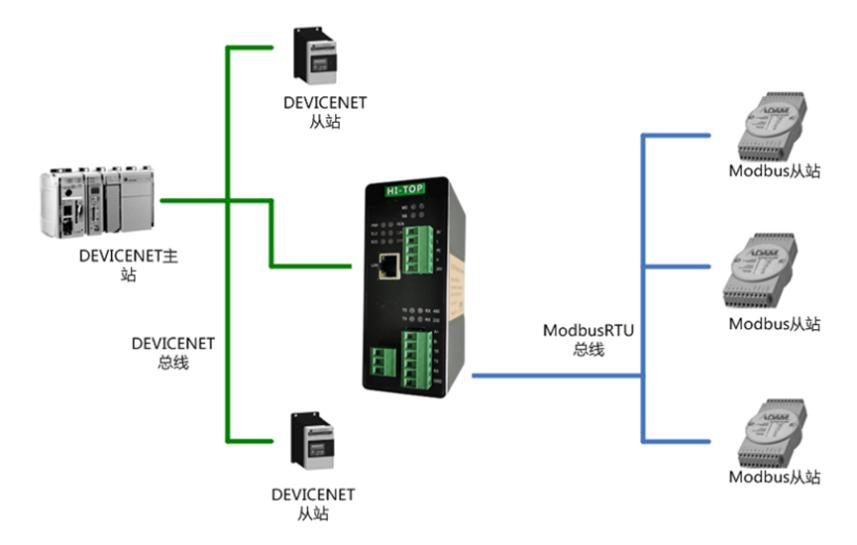 HT3S-DNS-MDN是一款 Devicenet从站功能的通讯网关。该产品主要功能是将各种 Modbus RTU设备接入到 Devicenet网络中。本网关连接到 Devicenet总线中作为从站使用,连接到 Modbus RTU总线中作为主站或从站使用。
