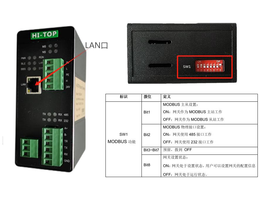 使用GW Modbus Builder连接到HT3S-DNS-MDN网关的LAN口,并将拨码第8位拨到ON,如下图所示。