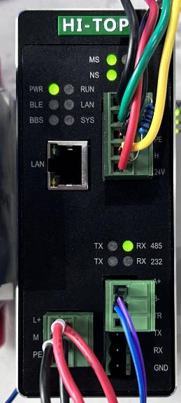 通讯线使用5口接线柱连接,网关6PIN端子的A+连接到接线柱的T/R+端口,网关6PIN端子的B-口到接线柱的T/R-端口,如图: