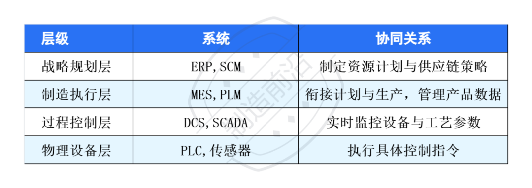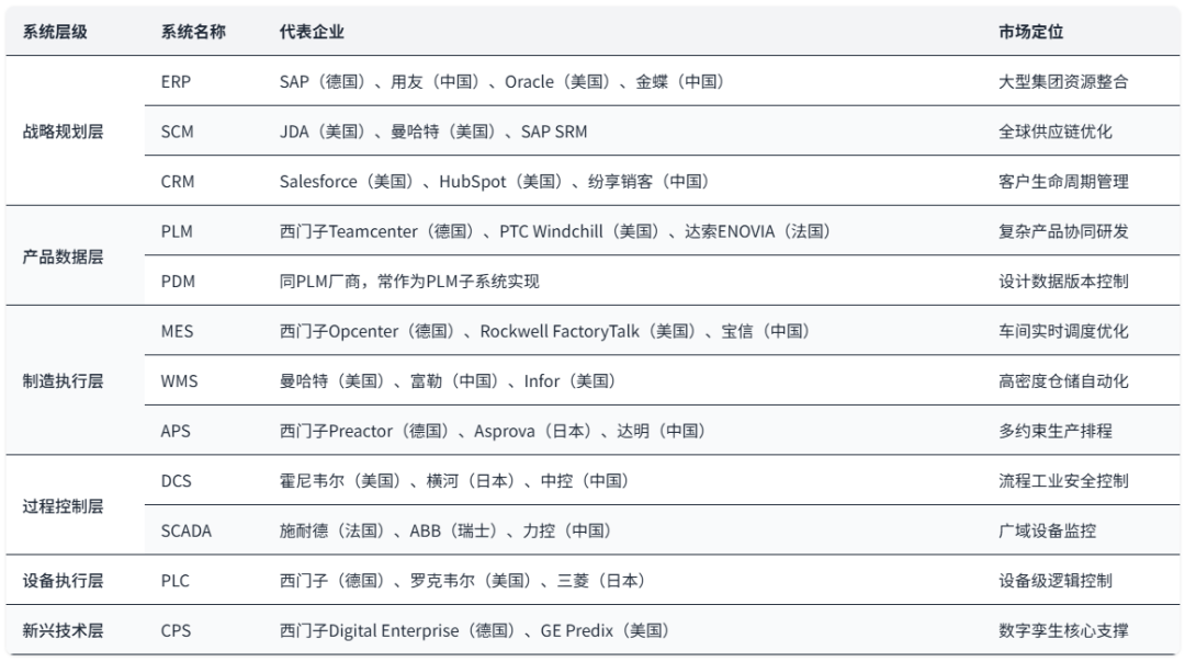 常见的工业软件包括PLM、ERP、MESWMS、PDM、SCM、CRM、SCADA等,整个软件系统大体分为三个层次: