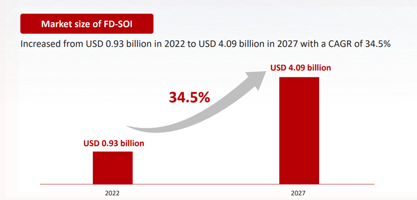 市场研究数据显示,FD-SOI市场规模预计将从2022年的9.3亿美元增长至2027年的40.9亿美元,年复合增长率高达34.5%,显示出强劲的增长势头。