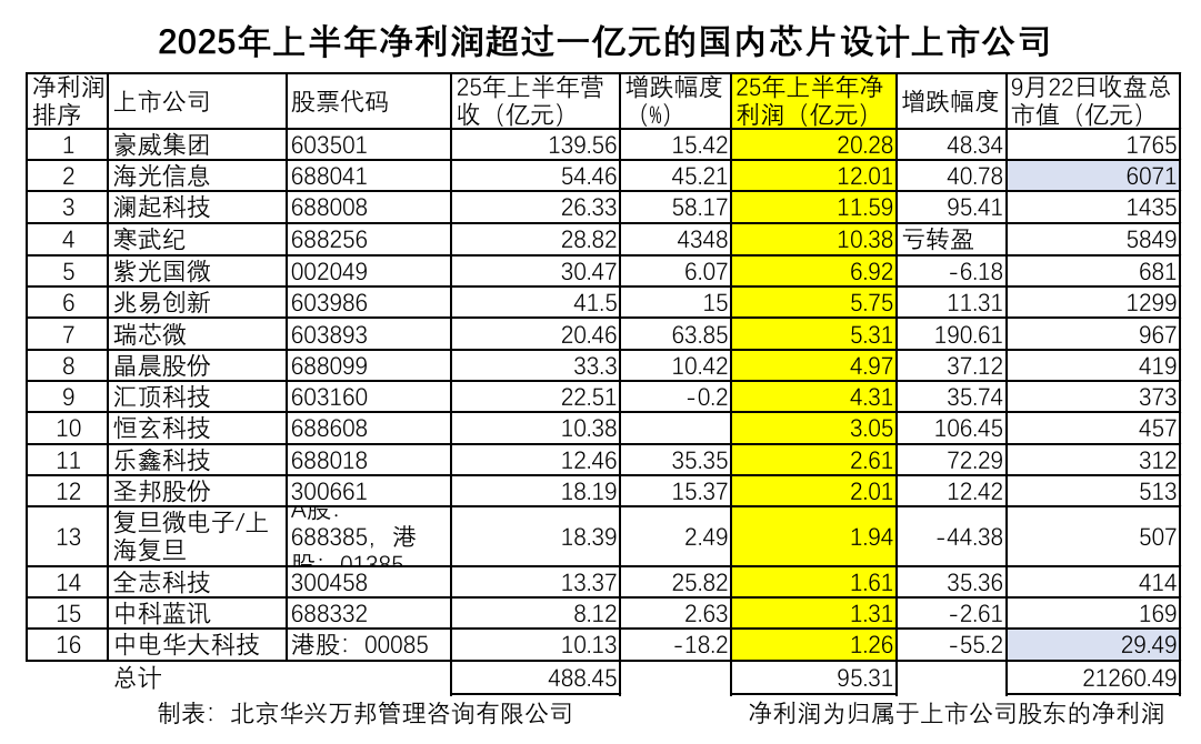 随着8月29日休市后在香港上市的中国电子华大科技有限公司(港股代码:00085)公布其2025年中期业绩公告,2025年上半年“归属上市公司股东净利润”超过一亿元的国内芯片设计上市公司基本浮出水面。根据北京华兴万邦管理咨询有限公司的统计,目前共有16家上市芯片设计公司半年净利润过亿,加上还有华为海思半导体、紫光展锐和国网智芯等多家有规模但未上市的芯片设计企业,他们的半年净利润也有可能超过了亿元,所以国内有20家左右芯片设计企业在今年上半年盈利过亿。他们在我国5000多家芯片设计企业中盈利能力排在了前3%,因而其中每一家都值得大家去关注和分析。