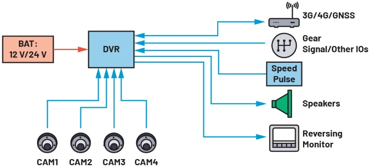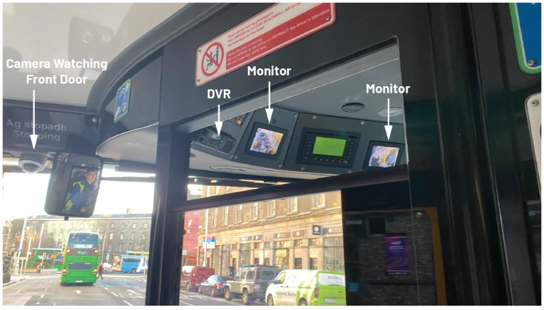 图2.公交车车载安防系统示例,展示了驾驶座摄像头、数字录像机(DVR)和监视器。