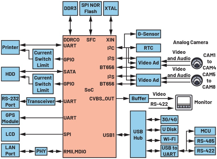 图5展示了一种常见的DVR硬件解决方案,其中的主要信号链路如下:外部模拟摄像头的模拟视频信号传输至视频模数转换器(ADC,又称视频解码器),由ADC将模拟视频信号(即复合视频基带信号(CVBS)、模拟高清(AHD)信号或传输视频接口(TVI)信号)转换/解码为数字视频信号,例如BT656。通常,CVBS可传输的最大分辨率为576i,而TVI则能传输8K12.5p的信号。模拟音频信号的处理方式与之类似,会被转换为I2S格式。一般而言,片上系统(SoC)本身配备视频输出端口,用于输出用户交互界面的视频流,通常为HDMI?、VGA或CVBS接口。