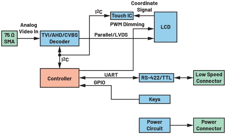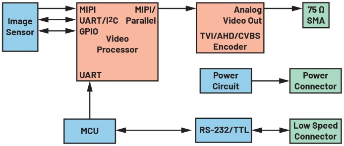 从左侧开始,AVI通过75 Ω连接器连接至系统。随后,模拟视频信号被送入TVI/AHD/CVBS解码器。解码器将多种视频格式转换为标准化数字输出。