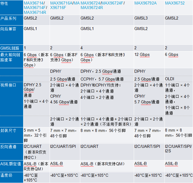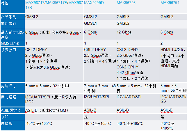 ADI公司已大幅扩展了面向摄像头与显示应用的GMSL产品系列,市场覆盖范围广泛。表1列出了最新GMSL2/GMSL3串行器的主要参数与特性,表2则展示了GMSL2/GMSL3解串器的对应参数与特性。所支持的视频接口包括LVDS、HDMI和MIPI CSI-2。其中,MAX9295D可与表1中标记为“向后兼容GMSL1”的器件配对使用。