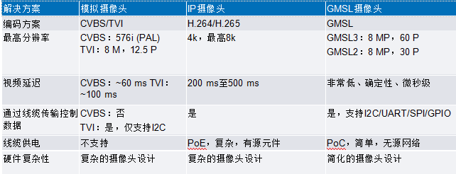 表1和表2所示的最大前向链路速率,指的是GMSL协议在串行链路上编码的比特率。与此同时,I2C、UART、GPIO等控制信号也通过该链路进行传输。表3对比了市场上与GMSL解决方案形成竞争的部分主流监控摄像头解决方案的性能参数。
