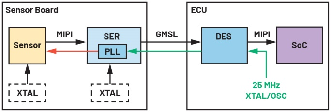 MAX96717/MAX96793系列支持反向通道参考时钟(RoR),即由解串器通过反向通道传输的时钟,使得传感器板可省去晶体振荡器(图14)。RoR省去晶体振荡器后,能带来多重优势:降低系统成本、提升可靠性、减少晶体振荡器使用量,同时简化电路板布局。