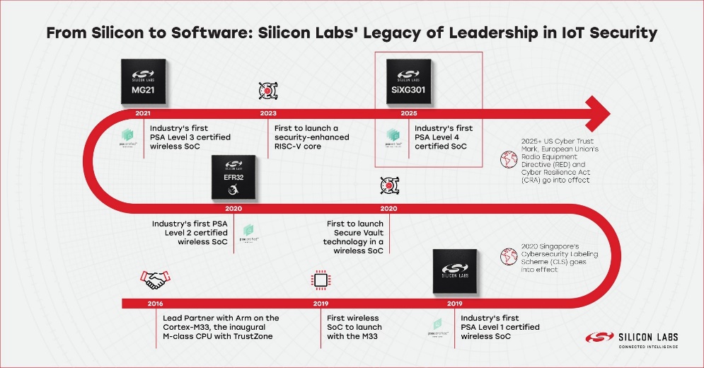 在认证与合规模型上,SiXG301作为第三代无线开发平台的首款SoC,依托全新一代Secure Vault安全子系统率先通过PSA 4级认证,使芯科科技成为首家抵达这一里程碑的物联网SoC厂商。PSA 4级聚焦强对手模型与复杂物理攻击(如激光故障注入、侧信道、微探测、电压操纵),通过该认证本身即是对长期防护能力的背书,也为客户在威胁建模与控制点落地上提供了可映射的实施框架。Matt Maupin强调:“安全性一直是我们产品设计的核心基石。”在此基线之上,SiXG301把可信启动、硬件密钥存储与抗物理入侵的存储接口合为体系化防线,既覆盖量产阶段的固件/密钥安全,也兼顾现场运维与生命周期更新。