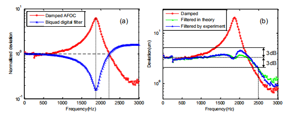 对比图3(a)中双二阶数字滤波器传递函数的频率特性曲线和AFOC滤波前的谐振特性曲线可知,双二阶数字滤波器的谷值频率与AFOC的峰值频率相等,归一化幅值约等于1处对应的频率与AFOC对应的频率相等,幅值的变化规律相反,证明了二者满足推导时的互补关系。用图1所示的测试装置测得AFOC实际滤波后的频率特性曲线,如图3(b)所示,实验滤波与理论滤波的结果基本相符,证明了理论建立的模型的正确性。由测得的AFOC滤波前和滤波后的频率特性曲线对比可知,经过双二阶函数滤波以后,AFOC的一阶谐振峰基本被抵消,获得了一条近似平坦的频率特性曲线,在3dB衰减范围内的有效带宽达到2.5kHz,证明了用双二阶数字滤波方法对控制信号滤波来提高控制带宽是可行的。