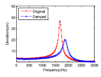 图2:自适应光纤准直器的减振前和减振后谐振特性曲线对比
