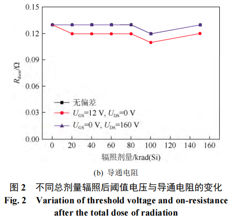 从图?2?试验结果可以看出,在不加栅压的条件下,总剂量辐照引起的阈值电压漂移较小,小于?10%,导通电阻保持在?0.12~0.13 ?,导通电阻变化小于0.01 ?;在施加栅极电压偏置时,总剂量辐照引起的阈值电压漂移明显,辐照总剂量达到?150 krad(Si)时,阈值偏移为?0.8 V,导通电阻在?0.11~0.13 ?。