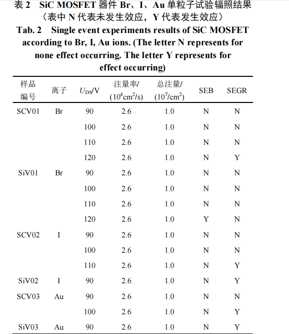 如表?2?所示,所有样品栅极电压均为?0 V。对SCV01、SiV01?两个样品,采用?Br?源进行单粒子辐照,参数如表?1?所示,总注量为?1.0×107?/cm2,其中SCV01?在?UDS=120 V?下发生?SEGR,由于样品栅极已经发生破坏性损伤,无法进一步测试?SEB?阈值,但可以看出在测试范围内样品未发生?SEB;SiV01在UDS=120 V下发生SEB。进一步对SCV02与SiV02样品采用?I?源进行单粒子辐照,参数如表?1?所示,总注量为?1.0×107?/cm2,SCV02?样品在?UDS=110 V?下发生?SEGR;SiV02?在?UDS=90 V?下发生?SEGR。对SCV03?与?SiV03?样品,采用?Au?源进行单粒子辐照,参数如表?1?所示,总注量为?1.0×107?/cm2,SCV03样品在?UDS=100 V?下发生?SEGR;SiV03?在?UDS=90 V下发生?SEGR。