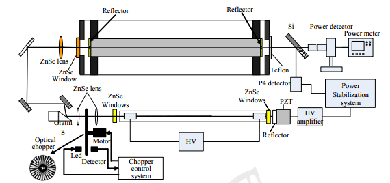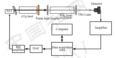 实验装置如图3所示,THz激光器采用直流激励的机械斩波调QCO2激光器作为泵浦源,调节光栅角度输出谱线9P(36)支,重复频率20kHz时,得到泵浦激光的平均功率最高为6.7W。在THz振荡器内充入甲醇工作气体,工作气压15Pa获得脉冲THz激光最高平均功率为7.2mW。THz激光经高阻硅镜片分束后,一束THz激光反射至P4型热释电探测器,探测到的脉冲信号送至控制系统经放大及整流电路后由计算机控制的采集卡采集电压信号分析电压变化后给出误差电压信号经电压放大器放大后反馈至泵浦激光器谐振腔压电陶瓷从而调节泵浦激光的频率,使THz激光稳定在极大值的位置。另一束THz激光透过硅片后入射至THz激光功率计,通过计算机实时记录监视THz激光的功率变化情况。