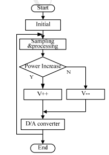 THz激光稳定控制系统原理如图1所示,主要包括THz激光探测器,数据采集卡,电压放大器。其中THz激光功率计探测到THz激光后得到直流电压信号。由计算机图形化编程Labview控制的数据采集卡对THz激光功率信号进行采集,并对采集到的信号进行分析,并给出误差电压信号控制数据采集卡上的D/A转换器输出模拟电压信号,经电压放大器放大后反馈至泵浦激光器谐振腔的压电陶瓷上。若电压增加,功率增加,则电压变化方向不变,电压继续增加,若功率降低则电压变化方向反向。使THz激光功率始终保持在极大值的位置。我们称之为极大值法,流程图如图2所示。