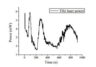 实验中,光泵THz激光系统处于自由运转的状态时,在15分钟内测量并记录了THz激光功率的变化情况,实验结果如图4所示,THz激光功率变化范围为1.5mW~6mW,变化具有一定的随机性,率变化速度最大0.088mW/s,功控制系统响应时间小于50ms,控制电压步长最小为500V/4096=0.12V,满足控制精度的要求,通过计算激光功率稳定度为0.75。压电陶瓷最大伸缩量10?m,因此压电陶瓷电压在0~500V变化时,对于F-P谐振腔及波长为9.69?m的泵浦激光而言,泵浦激光频率的变化周期大于2s,满足调谐要求。泵浦激光器的谐振腔长度为1.5m,自由光谱范围约为100MHz,甲醇气体共振吸收频率距泵浦激光谱线中心+24MHz左右,位于泵浦激光可调谐范围内。可粗略的估算最佳泵浦频率处泵浦激光功率大约处于最大功率和最小功率之间。