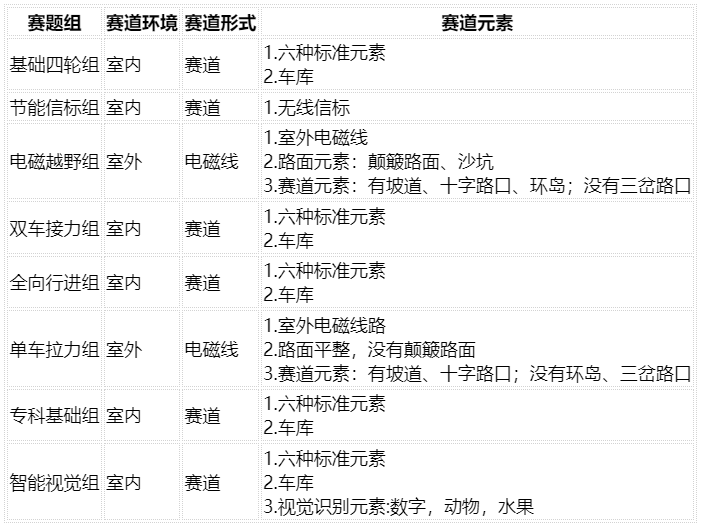 比如在 第十六届智能车竞赛分赛区赛道设计[1] 中,八个竞速组别赛道要求如下表格所示: