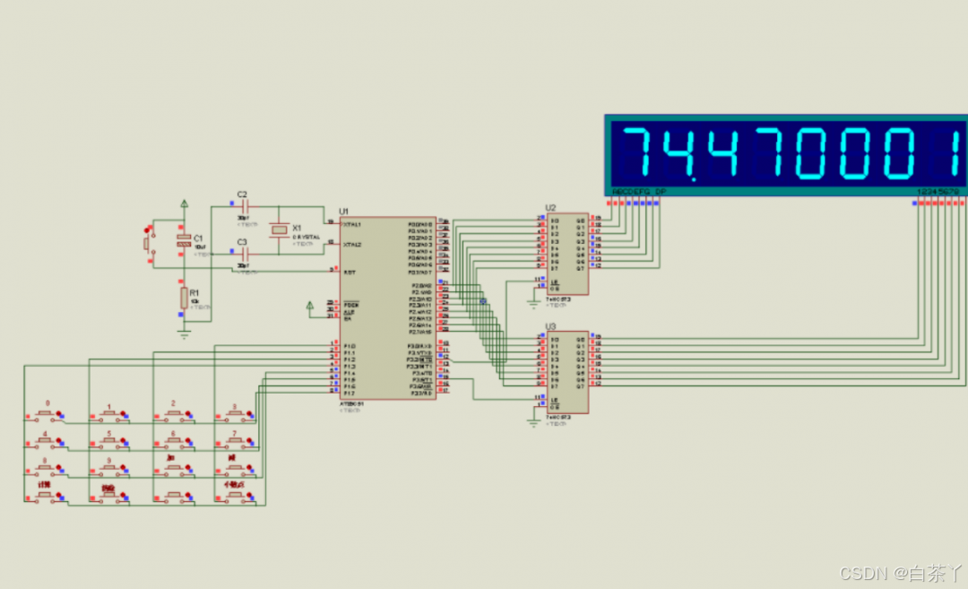 要求:以单片机最小系统为基础,利用键盘输入数字(1~5位,可包含小数),按下UP键(表示“+”),再输入数字(1~5位,可包含小数),最后按下ENTER键(表示“=”)可实现加法运算;同理,利用DOWN键(表示“-”)可实现减法运算;按下BACK键清除显示可重新计算;显示用数码管实现,通过两片74HC573驱动数码管。