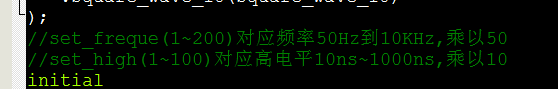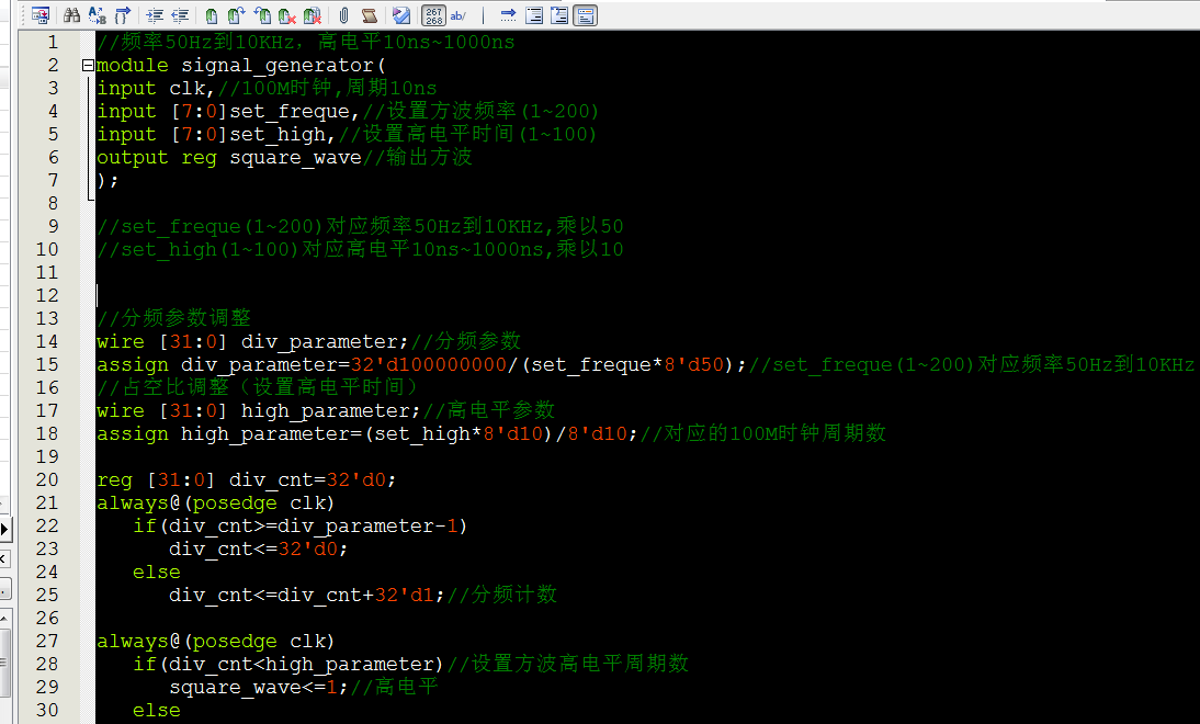 //频率50Hz到10KHz,高电平10ns~1000ns module?signal_generator( input?clk,//100M时钟,周期10ns input?[7:0]set_freque,//设置方波频率(1~200) input?[7:0]set_high,//设置高电平时间(1~100) output?reg?square_wave//输出方波 ); //set_freque(1~200)对应频率50Hz到10KHz,乘以50 //set_high(1~100)对应高电平10ns~1000ns,乘以10 //分频参数调整 wire?[31:0]?div_parameter;//分频参数 assign?div_parameter=32'd100000000/(set_freque*8'd50);//set_freque(1~200)对应频率50Hz到10KHz //占空比调整(设置高电平时间) wire?[31:0]?high_parameter;//高电平参数 assign?high_parameter=(set_high*8'd10)/8'd10;//对应的100M时钟周期数 reg?[31:0]?div_cnt=32'd0; always@(posedge?clk) if(div_cnt>=div_parameter-1) div_cnt<=32'd0; else div_cnt<=div_cnt+32'd1;//分频计数 always@(posedge?clk) if(div_cnt<high_parameter)//设置方波高电平周期数 square_wave<=1;//高电平 else square_wave<=0;