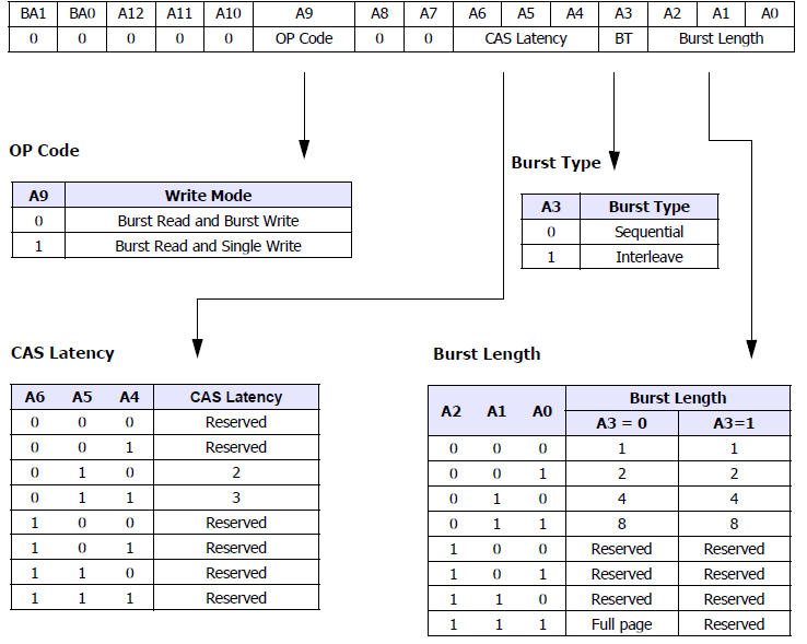 AX301/AX4010?开发板上的?SDRAM?的模式寄存器的?A0~A2?位为?SDRAM?读写?Burst?长度的设置;?A3?为?Burst?类型,选择连续模式还是交叉模式;?A4~A6?为?CAS?数据潜伏期设置;A9?选择工作模?式。