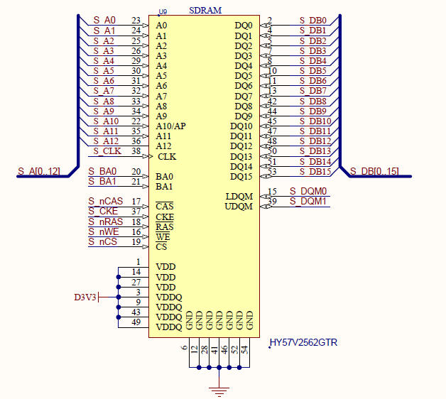 开发板设计采用 HY57V2562GTR/W9825G6KH/HY57V561620FTP 型号,容量为的 256Mbit,采用了 54?引脚的?TSOP?封装,?数据宽度都为?16?位,?工作电压为?3.3V,并且采用同步接口方式所有的信号都是时钟信号。