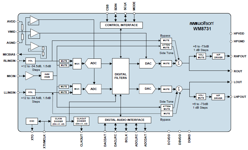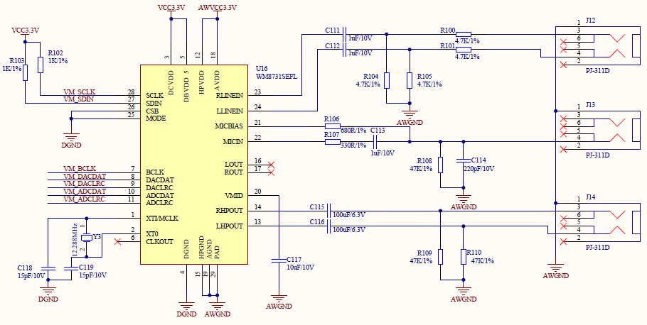 开发板音频模块使用WOLFSON公司的WM8731芯片实现声音信号的A/D和D/A转换功能。下图2.1为音频模块的硬件电路: