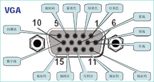 VGA接口是一种D型接口,上面共有15针孔,分成三排,每排五个。 其中比较重要的是3根RGB彩色分量信号和2根扫描同步信号HSYNC和VSYNC针。其引脚编号图如下图所示: