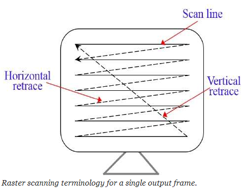 VGA 显示器扫描方式从屏幕左上角一点开始,从左向右逐点扫描,每扫描完一行,电子束回到屏幕的左边下一行的起始位置,在这期间,CRT 对电子束进行消隐,每行结束时,用行同步信号进行同步;当扫描完所有的行,形成一帧,用场同步信号进行场同步,并使扫描回到屏幕左上方,同时进行场消隐,开始下一帧。完成一行扫描的时间称为水平扫描时间,其倒数称为行频率;完成一帧(整屏)扫描的时间称为垂直扫描时间,其倒数称为场频率,即屏幕的刷新频率,常见的有 60Hz,75Hz 等等,但标准的 VGA 显示的场频 60Hz。其扫描示意图如下图所示