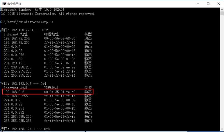 第二步:以管理员权限打开CMD窗口,输入arp–a查看ARP绑定结果,可以看到开发板的IP地址和MAC地址已经缓存。