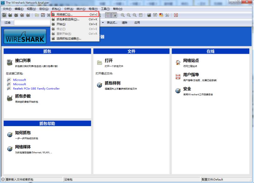 第六步:这一步对用户来讲是可选的,用户如果想查看更多数据包传输的信息,可以使用网络抓包工具Wireshark来查看PC的网卡接收和发送的网络数据,打开安装好的wireshark抓包工具,点击菜单抓包->网络接口。