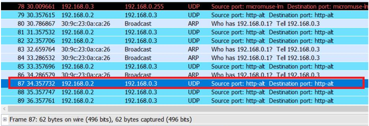 在wireshark抓包窗口我们可以看到开发板(192.168.0.2)向PC网口(192.168.0.2)发来的数据包,这里会显示数据包的目标MAC,源MAC,IP包头和UDP包等信息,如下图开发板抓包窗口显示: