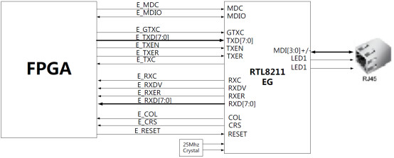 具体的网络协议格式和以太网RTL8211EG芯片说明,可在网站上和附带资料搜索。开发板的千兆网接口框图如下: